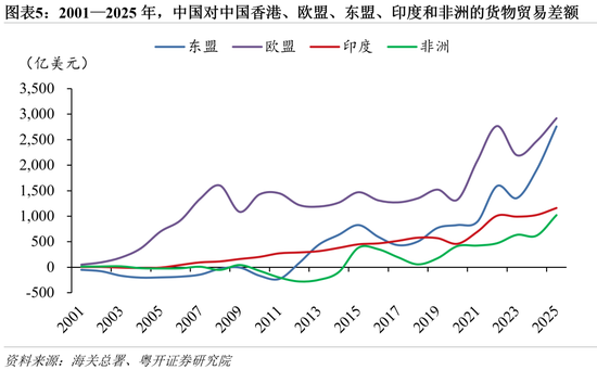 相较之下,中国对欧盟、东盟、印度和非洲的货物贸易顺差显著扩大。2025年,中国对上述经济体的货物贸易顺差分别达2918亿美元、2758亿美元、1161亿美元和1020亿美元,较2024年分别扩大18.1%、44.6%、13.3%和64.6%。