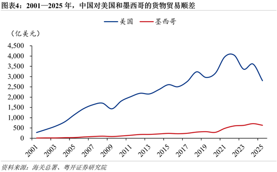 受美国关税政策外溢影响,中国对墨西哥货物贸易顺差亦出现收窄。2025年,美国对墨西哥加征25%的“芬太尼关税”,仅有符合《美墨加协定》(USMCA)原产地规则的墨西哥产品可享受对美零关税或低关税待遇。在此约束下,过去中国经由墨西哥转运、以规避美国对华“301关税”的相关产品出口空间被显著压缩,转口贸易效应减弱。2025年中国对墨西哥出口下降1.2%,为2021年以来首次负增长,其中,终端消费品出口下降4.7%。