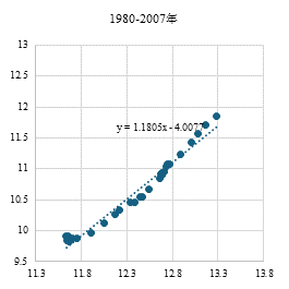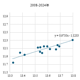 资料来源:Wind、工银国际整理(X轴、Y轴分别为取对数后的全球经济量与商品贸易量。)