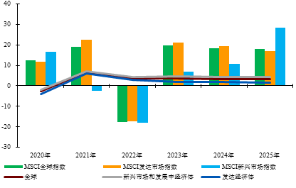 首先,风险资产仍具备高回报基础。在临界混沌区间内,宏观不确定性上升,但并不必然意味着增长动能枯竭。进一步看,资本市场对宏观经济的反应,并不取决于增长速度本身,而更多反映增长质量的变化,即对生产率提升、盈利结构改善与资本回报效率的前瞻定价。例如,在2020—2025年间,尽管全球GDP增速整体维持在3%左右的低斜率区间,MSCI全球指数及主要市场指数却多次录得显著高于经济增速的年度回报,显示资本市场对技术进步、产业重构与长期盈利能力改善保持高度敏感。