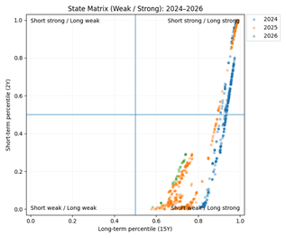 分位数回归框架:条件分布的状态刻画。在滚动分位数分析的基础上,本文进一步将美元指数的短期与长期状态映射至二维状态矩阵中,用以刻画其所处的结构位置。矩阵横轴表示基于长期窗口(15年)的分位数状态,纵轴表示基于短期窗口(2年)的分位数状态。该框架关注的重点在于识别美元当前所处的状态阶段。