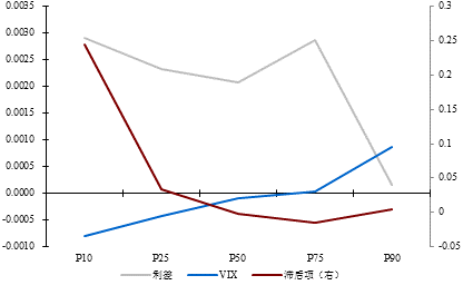 短长周期分位数的错位,反映出美元当前运行环境中的多重约束与拉扯。一方面,利差边际收敛、美联储或加速降息等因素,对美元形成阶段性压力。另一方面,美元作为核心储备货币所具备的资产属性,仍对其下行空间构成约束。这一状态判断为后续模型选择提供了直接依据。在趋势信号弱化、分布特征增强的阶段,采用分位数回归与历史条件模拟来刻画美元未来路径的不确定性与条件分布,具有更高的适配性。与传统回归侧重条件均值不同,分位数回归直接刻画解释变量在不同分布位置上对被解释变量的影响,更适合分析具有显著非对称性与状态依赖特征的金融时间序列。具体而言,模型以美元指数月度对数变动率为被解释变量,引入三类核心解释变量。一是滞后收益率,用以刻画美元指数在风险偏好变化与预期调整过程中的惯性。二是国债利差变量,用美国与德国10年期国债收益率之差衡量,用以刻画美元资产相对于其他核心货币资产的长期回报优势,反映全球资金在主要资产之间的配置取向。其三为标准普尔500波动率指数(VIX),用于刻画全球风险定价环境及避险需求的波动。该框架允许利差与风险因素在不同分位数水平上呈现差异化影响,从而更准确地刻画美元在低分位、中位与高分位状态下的响应特征,为后续分布预测提供基础。