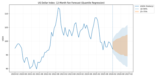 在此基础上,本文进一步采用历史条件模拟方法,对未来12个月美元指数的可能运行区间进行分布预测。具体而言,对近五年的利差与VIX指数的月度变动进行重抽样,构造一组可能的宏观状态路径,并在每一期结合分位数回归所刻画的条件分布进行随机抽样,从而生成美元指数未来路径的分布集合。相关结果以扇形图形式呈现,用以刻画不确定性随时间扩散的过程及区间约束的存在。预测结果显示,随着预测期限的延长,不确定性逐步累积,分布区间自然扩展。但在整个预测期内,中位路径及上下分位边界始终受到利差与风险定价机制的系统性约束。展望2026年,美元仍处于短期修正与长期支撑相互作用的方向选择阶段,在多重力量的拉扯下或将继续呈现反复、拉扯,美元指数更可能在较宽区间内通过震荡波动完成阶段性再平衡。