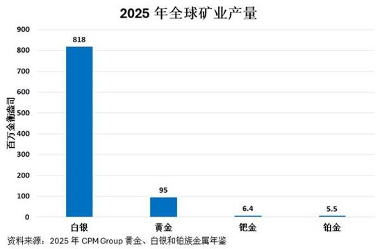 2025年,全球矿企总计开采了8.18亿盎司白银、9,500万盎司黄金、640万盎司钯金和550万盎司铂金(图8)。不过,单看矿产供应规模,并不足以全面反映这些金属市场的相对体量。