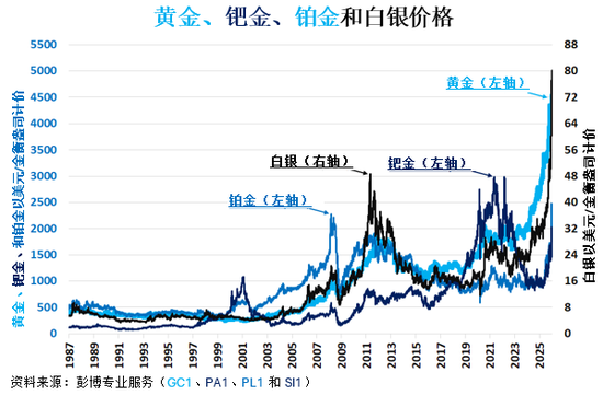贵金属价格在2025年末的大幅上涨趋势延续至2026年初,黄金价格已突破每盎司4,500美元,白银价格突破每盎司80美元,铂金更是达到2007年以来的首次纪录高位。钯金价格同样出现大幅反弹,但距离纪录高位仍有相当距离。