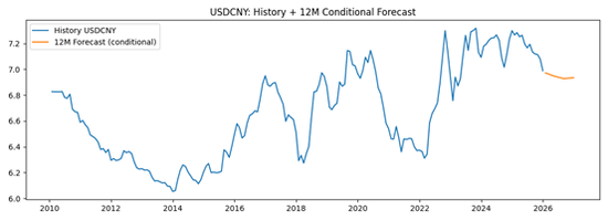 在此基础上,本文进一步给出了一条12个月条件性预测路径。需要强调的是,该预测没有对通胀、利差或美元指数等宏观变量进行线性外推,而是基于宏观环境维持最近一期水平的假设前提下,刻画历史结构所隐含的汇率演化趋势。其意义在于揭示人民币汇率在宏观约束下的可预测边界,而非为了提升短期点位的命中概率。从结果来看,美元兑人民币未来12个月的运行中枢相对收敛,条件预测路径所对应的中枢带大致落在6.9附近,人民币温和升值并未呈现单边快速升值或贬值特征。