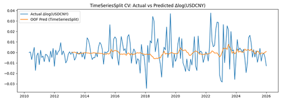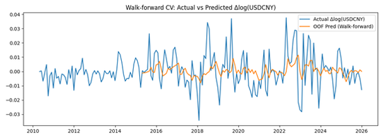将时间序列分割与逐期扩展窗口回测结果结合来看,人民币汇率的可预测边界进一步得到验证。两种验证方式在不同样本结构下均呈现出高度一致的特征。模型能够提取低频结构信息,却系统性低估实际汇率变化中的尖峰与快速反转。这种跨验证框架反复出现的结果,意味着预测能力的边界并非由样本切分或技术设定所致,而是源于汇率运行本身的性质。在宏观月度信息集下,人民币汇率的短期波动仍以不可预测成分为主,预测能力存在清晰且稳定的上限。