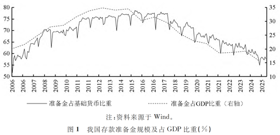 我国存款准备金制度确立以来,其功能定位由最初的保障银行支付清算的基础性安排,逐渐演变为央行实施流动性管理的重要货币政策工具(石涛,2019)。截至2025年7月,其他存款性公司在央行持有的准备金存款规模为21.47万亿元,约占基础货币的58%,相当于2024年名义GDP的16%,在以银行信贷为主导的间接融资体系中占据关键地位。过去十年,法定存款准备金率稳步下调,向市场释放大量流动性。但随着准备金规模占比降至历史相对低位水平,其在总量调控中的作用或将减弱(张启迪,2021),下阶段存款准备金转型方向及与其他政策工具的协同机制,或为货币政策框架优化的关注重点。