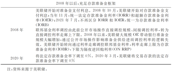 2008年金融危机后,美联储在大规模量化宽松(QE)的背景下,转向充足准备金框架,并沿用至今。在充足准备金框架下,美联储调控准备金规模进而影响利率的逻辑失效,转而通过利率走廊引导联邦基金利率,使其维持在目标区间。2008年金融危机后,美联储大规模 QE带动银行准备金规模大幅增加、银行体系流动性过剩,美联储于2008年开始对准备金支付利息,以此回收银行过剩流动性。在该框架下,联邦基金利率对准备金规模变化不敏感,通过公开市场操作影响准备金供给进而调控利率的逻辑失效。美联储货币政策由稀缺准备金框架转向充足准备金框架,开始通过利率走廊引导联邦基金利率,使其维持在目标区间。2020年,受疫情冲击,美联储将交易存款的法定存款准备金率下调至0%,法定存款准备金要求实质取消。