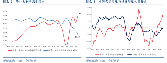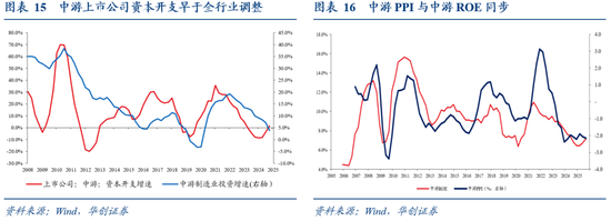 1)为何关注中游?主要是今年中游出现了四个积极的变化。一是盈利能力开始修复,ROE率先回升。二是“反内卷”更聚焦中游,或继续约束供给,从目前的中游投资与中游需求对比来看,中游率先出现投资增速低于需求增速。三是海外收入占比以及盈利占比上升,受外需影响更大,与上游或下游相比,景气独立性或更强。四是率先受益科技革命,在海外AI资本开支继续增加,国内强调科技自立自强背景下,预计同样会加大投入,中游受益(可能途径是企业设备购置投资增加或政府采购增加)。