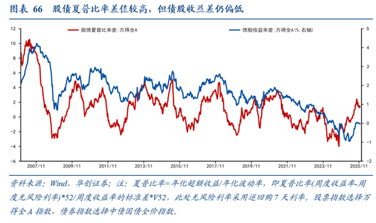 第二,波动率将影响股债配置价值的考量。以夏普比率差衡量股债配置价值差异,以债股收益差(10年国债利率与全A股息率差值)衡量两者估值差异。两者若出现背离,则可能有一方的估值相对于其配置价值太高或太低。截至2025年11月21日,股债夏普比率差为1.34,仍处于历史相对高位(十年72%分位数),但债股收益差为-0.03%,仍处于历史低位(十年11.9%分位数)。我们看好股市波动率在“十五五”期间中枢回落,则大概率债股收益差将向股债夏普比差靠拢,即,当前,债相对于股依然偏贵,更看好股市的配置价值。