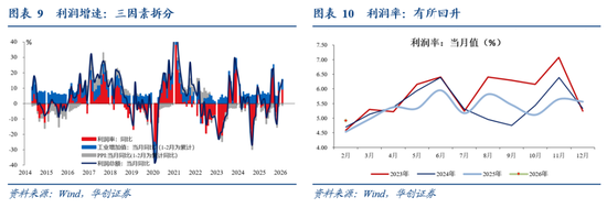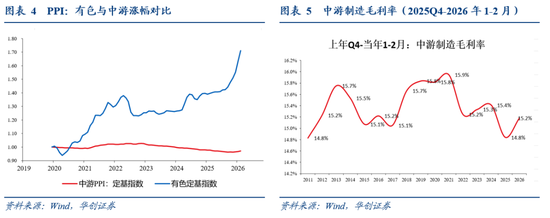 2025年10月以来,有色金属涨幅较大。以PPI有色矿产、PPI有色加工两大行业来看,整体的价格上涨幅度为18.6%(2025年10月-2026年2月),同期,中游制造业的PPI累计上涨幅度为0.9%。从中游制造业的成本端来看,有色采矿与有色加工合计的成本占全部成本之比为9%,因而有色金属的大幅上涨对其成本带来较大冲击。观察上年Q4至今年2月期间中游制造业的毛利率变化。期间,毛利率为15.2%,好于去年同期的14.8%。即,有色金属大幅上涨的五个月时间内,中游整体的毛利率不降反升。原因或与收入增速较快、中游本身出厂价格也有所上涨有关。