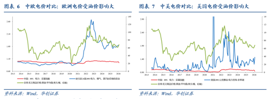 其中,油价对电价的影响,以2022年为例,受俄乌冲突影响,全年油价中枢大幅上行。欧洲电价(PPI口径,代表工业用电,下同)全年上涨61%,美国电价全年上涨90.5%。中国电价全年仅上涨5.1%。