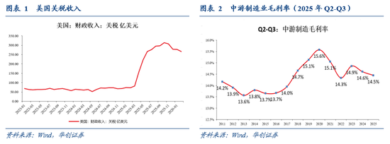 2025年4月开始,美国对全球大幅增加关税。从关税收入来看,去年3月为81.6亿美元,到去年9月,关税增加至296.7亿美元,随后到2026年2月,降至265.9亿美元。因而,可以认为,关税压力最大的时候,在2025年的Q2-Q3。关注这段时间的中游制造毛利率,中游制造的毛利率为14.5%,相比2024年的Q2-Q3,仅回落0.1个百分点。