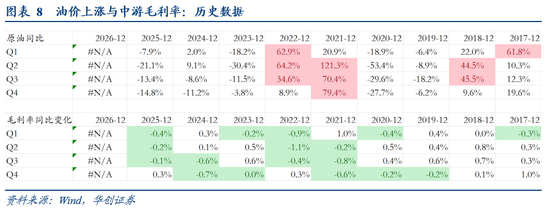 第三重考验或来自油价。油价的影响一方面可能通过化工或电价传导至中游的成本端,另一方面可能通过需求侧的冲击,影响中游的价格传导。从历史经验来看,油价上涨有发生过中游毛利率进一步提升的时间段(2018年Q2-Q3),也发生过毛利率下降的时间段(2021年Q2-2022年Q3)。本轮油价上涨对中游的毛利率影响有待观察。