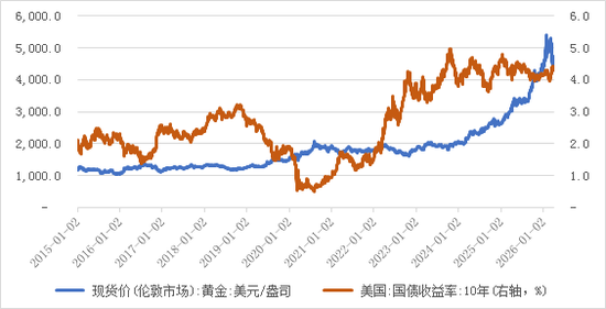 该负相关关系一直是黄金定价的经典逻辑。美元指数走强,以美元计价的黄金对非美货币持有者而言成本上升,需求下降,金价承压;美债收益率上行,美元资产吸引力提升,资金从无息黄金转向生息美债,金价同样承压。2026年2-3月金价的快速回调,核心诱因就是美元指数快速突破100关口、10年期美债收益率大幅上行,未来这一负相关逻辑仍将影响金价预期。