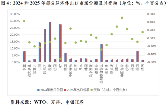 从2025年相对2024年的出口市场份额变动情况看,贸易战的主要受益者包括:中国台湾上升0.51个百分点、瑞士上升0.28个百分点、中国香港上升0.24个百分点、沙特上升0.22个百分点、越南上升0.15个百分点、爱尔兰上升0.13个百分点、新加坡上升0.10个百分点、马来西亚上升0.08个百分点;东盟国家整体份额上升0.42个百分点,或反映了关税冲突下的出口转移效应。