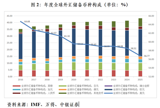 进一步分析,截至2025年底,全球美元储备份额为56.77%,下降1.75个百分点,2017年以来,除2023年小幅反弹0.03个百分点外,其他年份均为震荡下跌,美元储备份额跌至1999年有季度数据以来的新低。IMF披露币种构成的其他七种主要储备货币中,欧元、日元储备份额分别上升了1.33、0.16个百分点,加元、英镑、人民币、澳元、瑞郎储备份额分别回落了0.34、0.18、0.11、0.01和0.002个百分点;IMF不披露币种构成的其他货币是仅次于欧元的第二大赢家,储备份额合计上升0.90个百分点。