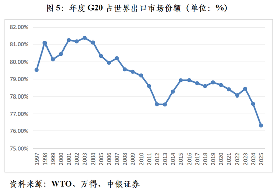 此外,20国集团(G20)整体份额为76.31%,较上年底回落1.26个百分点,更是创下1999年该机制创立以来的新低,累计回落了3.83个百分点。该机制由G7财长会议于1999年倡议成立,最初为财长和央行行长会议机制。2008年国际金融危机后升级为领导人峰会,2009年匹兹堡峰会正式确立其全球经济治理核心地位。其中,维护多边贸易体系,支持自由贸易是G20的重要宗旨。然而,自2017年以来,G20的出口市场份额除2019和2023年环比回升外,其他年份均震荡下行,显示G20在多边贸易体系中的影响力日渐式微。