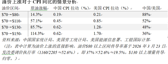中国的能源消费结构和成品油定价机制共同决定,同等幅度的国际油价上涨,对中国CPI的边际影响明显低于美国,且油价越高,这一差距越明显。