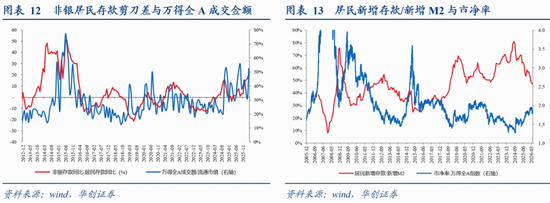 针对上述指标与资本市场相关的背后逻辑,我们认为,结合上文三部门存款分布框架,考虑到企业存款+非银机构存款+居民存款可以近似的理解为M2,因此新增居民存款占新增M2的比重或是评估货币流动速率的重要指标。如果新增居民存款占新增M2的比重抬升,这意味着本轮货币投放期间,货币更多的被居民淤积在了存款账户,企业和非银部门自然面临存款流失的压力,因此实体经济利润和金融市场成交额或有下行的可能,对应宏观风险偏好降低,资产有估值调整的可能;相反,如果新增居民存款占新增M2的比重回落,这意味着本轮货币投放期间,居民存款意愿下降,货币被更多的通过消费和投资等方式流入企业部门和非银机构,那么实体经济利润和金融市场成交额均有向上抬升的可能,对应宏观风险偏好抬升,资产有拔估值的可能。