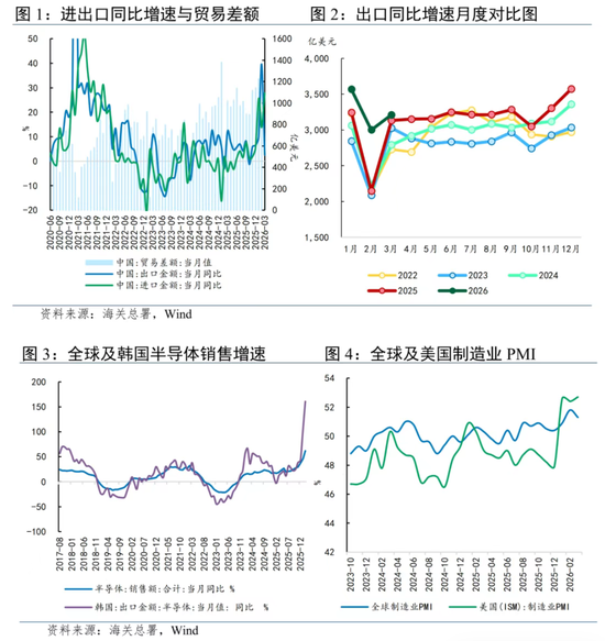 油价冲击尚未显现,外需韧性犹存。美以伊冲突持续升级,全球原油供应收紧、价格暴涨,3月欧佩克石油日均产量骤降788万桶至2079万桶。不过,在释放战略储备、放松石油禁运等因素支撑下,油价上涨尚未对制造业产生明显冲击。全球制造业连续第8个月高于荣枯线,录得51.3%,较上月下降0.5个百分点:美国ISM制造业PMI录得52.7%,环比上月提高0.3个百分点;欧元区由50.8%提高至51.6%;日本、韩国分别录得51.6%、52.6%,均连续四个月高于荣枯线。