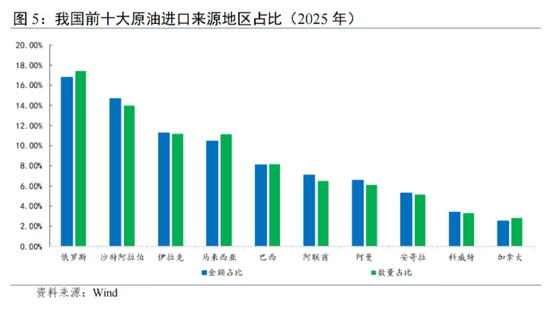 短期来看,海峡阻滞将影响我国原油进口。我国原油对外依存度超过70%,2025年原油进口约1155万桶/日,其中约40%~50%的运输需经过霍尔木兹海峡,沙特延布港、阿联酋富查伊拉港和阿曼马斯喀特港等替代路线,大约能弥补海峡通行量的30%。假设原油价格中枢从70美元/桶提高至90美元/桶,价涨量跌导致日均原油进口金额下滑约7%~16%,原油在我国进口商品中占比10.6%(2月份),计算得到拖累整体进口0.7~1.7个百分点。由于未考虑俄罗斯、中亚、非洲及南美等地区的进口来源替代,实际影响相对更小。