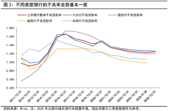 一是不良率走势与前述资产质量压力阶段表现一致。2015年前后不良率较高,2020年疫情期间短暂性反弹,近几年有所回落,但仍然没有回到历史低位,资产质量仍然承压。不同类型银行的不良率走势比较接近,说明宏观经济的系统性因素影响很大,在宏观经济整体下行过程中,所有类型银行的资产质量都会受到影响,尽管程度不一。