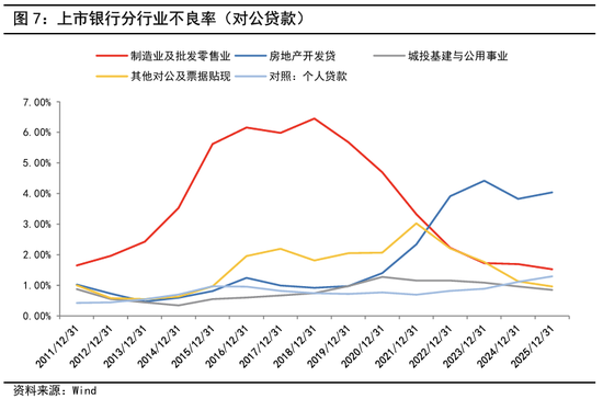 尽管资产质量持续承压,但压力来源却不断变化。最开始暴露风险的是2011年开始的制造业及其下游的批发零售业,然后是2021年开始的房地产开发贷、2022年的个人住房贷款,2024年以来则以个人消费贷款和经营性贷款风险暴露较多。银行的主要贷款投向包括制造业及批发零售业、房地产开发贷和个人住房贷款、城投基建与公用事业贷款、个人消费贷(含信用卡)、个人经营性贷款。到目前为止,只有城投基建领域的资产质量一直保持较优水平,其他领域的贷款已经轮流暴露风险,其中个人住房贷款、个人消费贷款和个人经营性贷款目前仍在不良暴露高峰期。