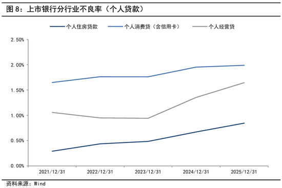 2024年以来,随着经济增速回落,叠加前期在零售转型背景下银行扎堆投放零售信贷,个人贷款不良率开始快速上升,尤其是普惠贷款项下的个人经营性贷款不良率上升更快。个人贷款的不良率目前仍未见顶。