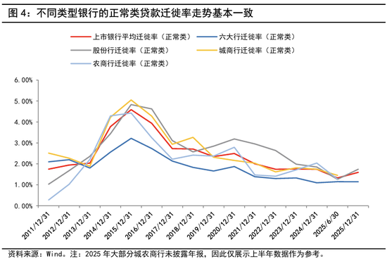 三是从迁徙率来看,其变化趋势也与前述资产质量发展阶段对应。正常类贷款迁徙率与不良生成率有些类似,前者可以理解为“不良及关注生成率”。从正常类贷款迁徙率走势来看,2015年前后同样是高峰,疫情期间短暂性上升,近几年回落。