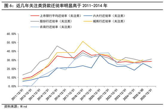 但与不良生成率不同,正常类贷款迁徙率目前整体而言低于2011年,对此我们可以这样来理解:2011年的时候有不少正常类贷款变成了关注类贷款(因此正常类贷款迁徙率较高)但是没有变成不良贷款(因此不良生成率较低),这可能跟银行“财技”有关,即在前些年监管没有那么严格的时候,银行对不良的认定有一定主观性,通常会将一些资产质量较差的贷款放在关注类贷款当中而不是放在不良贷款当中。这一点也可以从其他数据中得到验证,即近几年随着监管加强,越来越多的关注类贷款调整为不良贷款,因此我们看到关注率与不良率之间的差距明显缩小了。此外,从关注类贷款迁徙率来看,也能印证这一点,即2014年之前关注类贷款迁徙率明显低于后面几年,说明2014年之前银行的不良贷款认定口径相对较松,不少资产质量较差的贷款堆积在关注类贷款中而没有认定为不良贷款。