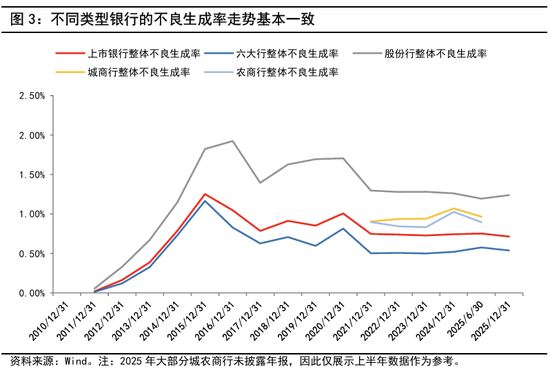 二是从不良生成率来看,也是同样的走势,高点出现在2015-2016年,2020年疫情期间短暂上升,目前仍未回落到历史低位。不同类型银行走势基本一致,再次说明宏观经济的系统性影响很大。但不同类型银行之间的不良生成率走势绝对值差异非常大。从不良生成率指标来看,在不良未暴露时期(比如2011年),不同银行之间的资产质量差异微乎其微,但是当不良大量暴露时(比如2014年以来),这种差异就变得非常明显,正可谓“只有潮水退去时才知道谁在裸泳”。客群相对偏向大型国央企、低风险住房贷款的六大行不良生成率较低,贷款客户相对下沉的股份行不良生成率较高。