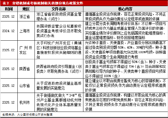 容错机制方面,1号文件作为首个从顶层制度层面为容错机制松绑的国家级文件,明确支出要建立健全容错机制,构建科学化、差异化、可量化的绩效指标体系,不简单以单个项目或单一年度盈亏作为考核依据,鼓励建立以尽职合规责任豁免为核心的容错机制。2025年5月,国家金融监督管理总局等八部门关于印发《支持小微企业融资的若干措施》的通知,探索优化政府投资基金绩效考核机制,拉长考核评价周期,提高风险容忍度,发挥好投早投小的引导作用。2025年12月,国务院国资委发布《中央企业违规经营投资责任追究实施办法》,增加了经营投资尽职合规免责条款,强化中央企业对战略性新兴产业、科技创新等领域探索性试验、先行先试的保障。地方层面,探索更为丰富,如杭州公布产业基金投资尽职合规免责清单;上海推行分层分类的长周期考核评价体系;广州开发区(黄埔区)科技创新创业投资母基金直接股权投资实施细则更明确提出,种子直投、天使直投单个项目最高允许出现100%亏损。