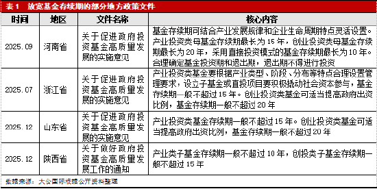 引导基金之所以能够成为耐心资本的重要来源,关键在于其突破了传统基金的期限约束。2025年1月,《国务院办公厅关于促进政府投资基金高质量发展的指导意见》(国办发【2025】1号,以下简称“1号文件”)文件明确要求“合理确定政府投资基金存续期”,在需要长期布局的领域,可采取接续投资方式,确保投资延续性,同时鼓励创业投资类基金“可适当提高政府出资比例、放宽基金存续期要求”。继1号文件发布后,各地区积极出台相关实施意见,对基金存续期进行约定。在实践中,国家级创业投资引导基金存续期设定为20年,陕西科创母基金同样设置为20年。据不完全统计,2025年新设引导基金中已有53%允许子基金存续期在10年以上。