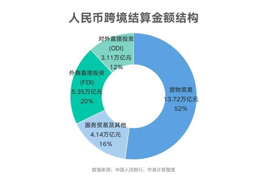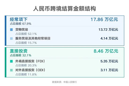 进入主题前,我们先看两张数据图表。人民币跨境结算金额的结构通常包括经常项下和直接投资两大类。目前,经常项下结算占比达到了总规模的67.9%,金额为17.86万亿元(见下图)。货物贸易仍在经常项下占主导地位,占比达52.1%,金额为13.72万亿元;与此同时,服务贸易及其他经常项目的占比正呈现出稳步上升的态势,目前已占总规模的15.7%,金额为4.14万亿元。