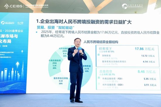 在当前全球产业链加速重构和中国企业贸易与投资“双轮驱动”出海的背景下,人民币跨境投融资需求的蓬勃发展,已成为金融支持实体经济高质量发展的重要环节。随着人民币在国际贸易融资中的地位稳步提升,其作为融资货币功能的深化正迎来前所未有的窗口期。在“中欧陆家嘴金融50人论坛·2026春季会议”上,中欧陆家嘴国际金融研究院高级学术顾问、中国首席经济学家论坛研究院院长盛松成,通过详实数据揭示了人民币在低利率环境与复杂国际局势下的核心融资优势。本文基于盛教授现场演讲整理而成。