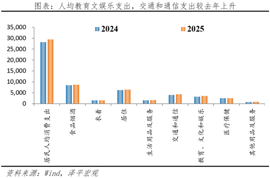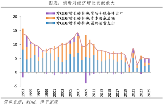 消费对经济增长的贡献抬升,但居民消费率与全球仍有明显差距,消费动能提升空间大。最终消费支出对GDP增长的贡献率从2024年的44.5%提升至2025年的52%,成为拉动当年经济增长的第一动力。世界银行数据表明,2025年中国居民消费支出占 GDP 比重约为39.9%,2024年全球平均在60%左右,美国约为67.9%,欧盟约为52.8%。相较于发达经济体和多数新兴经济体,中国仍是投资和出口偏重、居民消费偏轻的结构,说明在收入分配、社会保障、公共服务、消费环境等方面仍有较大的制度性和结构性挖潜空间。