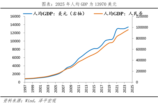 我国已接近高收入国家标准,但距离2万美元的发达国家门槛仍有一段距离。2025年人均GDP为99785.7元,名义增长4.2%。2024年全员劳动生产率为173898元/人,比上年提高4.9%。按世界银行最新标准,高收入国家人均GNI门槛约为14005美元。以美元计价,我国2025年人均GDP为13970.0美元,2024年人均GNI为13357.6美元,高度接近高收入国家门槛。