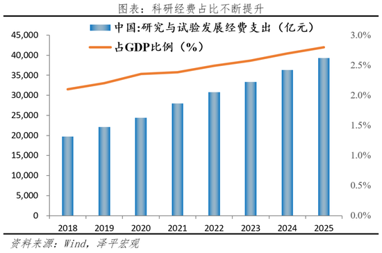 研发投入强度继续上台阶,硬科技基础正在从量的追赶走向质的提升。2025年全国R&D经费投入与 GDP之比提升至2.8%,相比2000年的1.0%相比实现大幅提升,首次超过OECD国家平均水平。截至2025年底,国内发明专利有效量突破500万件,每万人口高价值发明专利拥有量提升到16件,PCT国际专利申请量连续多年位居全球第一。在此基础上,中国在2025年全球创新指数中的综合排名首次进入前十,创新产出排名居世界前列,反映出从“量的积累”向“质的跃升”的转变。