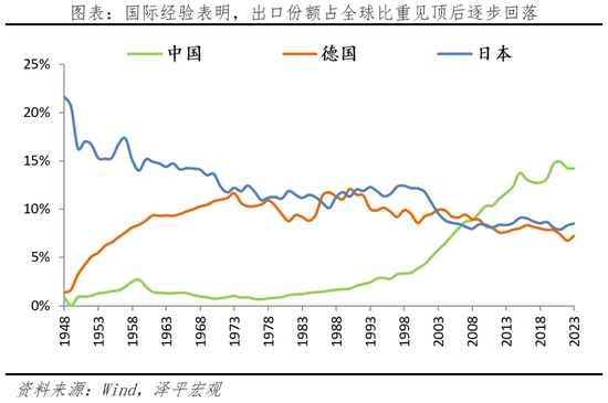 2026年稳外贸压力较大,未来出口将从高增长时代迈入结构性增长新时期,增量空间聚焦于结构性突破。具体来看,一是全球贸易格局深度重构,2026年中国出口仍面临不确定性。2025年以来,美国滥用关税、在逆全球化和贸易保护主义愈演愈烈。二是出口增速回归常态化是大势所趋。长期各国经验表明,各经济体出口份额触及12%-15%高点后均有所回落。战后日本、德国的出口份额分别在1957年、1990年达到17.3%、12.1%的峰值后逐步回落,目前维持在7%-8%份额。而中国出口份额占比在2021年已达到14.9%的高点,叠加超45万亿元的贸易基数,持续高增长难以为继。三是贸易结构性优化,为出口增长提供新动能,主要有三大特征:市场结构从过度依赖欧美市场转向“一带一路”等新兴经济体,贸易伙伴更加均衡;产品结构从劳动密集型产品、中低附加值品转向高附加值、绿色新产品;企业从代工出口模式向出海转型,跨级电商、组团出海蓬勃发展,从“产品出海”走向“品牌出海”,从“中国制造”走向“中国智造”。