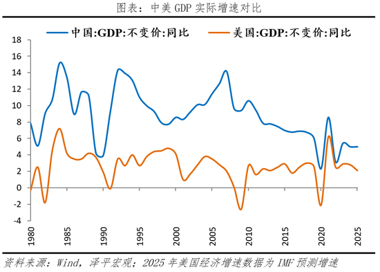 2025年中国GDP实际增速5.0%,低于1978-2008年高速增长期的平均增速9.8%,但仍处于中高速增长区间,美国GDP增速约2%-3%。