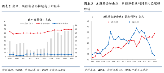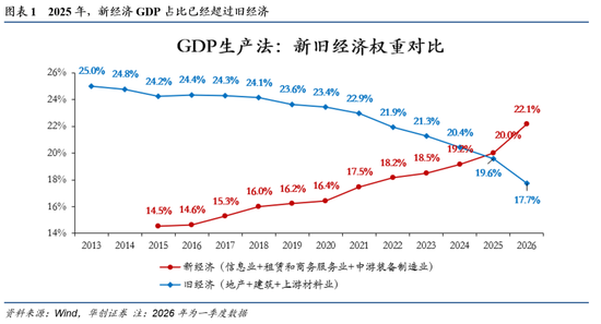 第一,新旧经济的GDP 占比,在 2025 年首次完成黄金交叉。我们定义的新经济,包括信息传输、软件和信息技术服务业、租赁和商务服务业,以及八大装备制造业(即中游制造板块);旧经济则以房地产、建筑业及九大原材料制造业为代表。在此之前,旧经济的 GDP 占比始终高于新经济,而 2025 年二者占比完成交叉,新经济 GDP 占比正式超过旧经济。其影响在于,由于新经济以直接融资为主,即便存在间接融资,其杠杆率也远低于地产、基建板块。所以单位 GDP 对债务扩张的效应、对债务的依赖度,将出现趋势性下降。