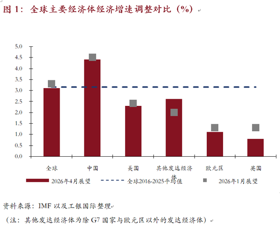 “莫听穿林打叶声,何妨吟啸且徐行。”2026年仲春,全球经济再次行至十字路口。IMF(国际货币基金组织)于4月14日最新发布的《世界经济展望》报告,如同一面棱镜,折射出全球经济繁荣表象之下的结构疲态与动荡之中的韧性边界。报告开篇即指出,全球经济正再次经受严峻考验,IMF下调2026年全球经济增速预期0.2个百分点,以反映逐渐显性化的地缘风险扰动。从绝对水平看,增长预期仍然处于历史中枢附近,也意味着若冲突持续时间可控,全球经济仍然具备一定的修复能力。相比于总量的整体稳健,全球经济增长结构则加速分化。地缘政治压力对不同贸易结构经济体的影响有所不同,发达经济体与新兴市场内部亦出现分层。