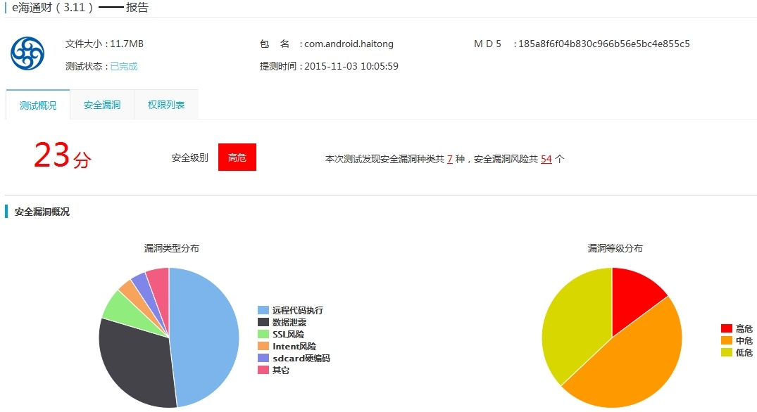 在阿里移动质量中心安全性测试中,海通证券E海通财被认为有高危风险,“