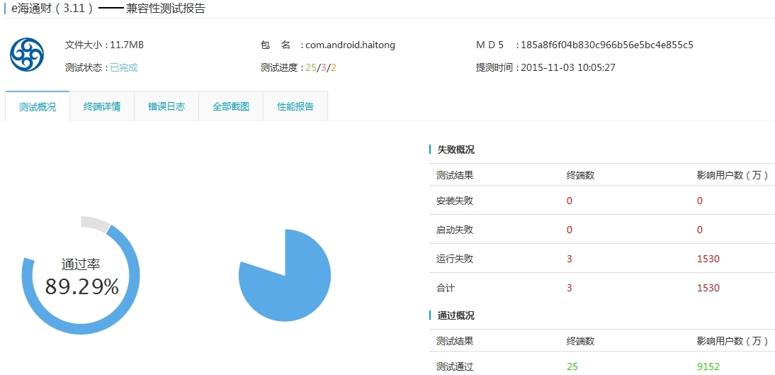 海通证券e海通财兼容性测试表现挺好,有89%通过率,兼容性问题主要出现在运行失败,主要发生在华为和小米用户中。在稳定性测试这块,通过率为33%。 e海通财在去年测评中软件版本号为V2.21,大约一年过去,版本升级到V3.11,版本号命名规则大概遵循这样规律:主版本号 . 子版本号 [. 修正版本号 [. 编译版本号 ]],可以看出海通版本升级较快。
