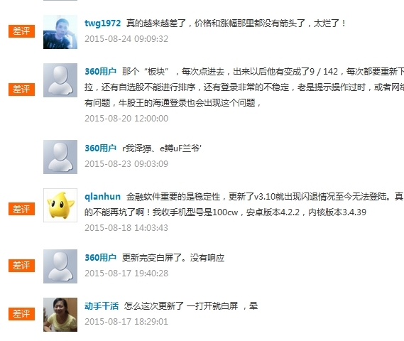 过浏览主流app下载平台用户反馈,发现安卓用户对海通证券e海通财主要反馈集中在闪退和白屏现象。 用户“手动干活”8月17日反馈“怎么这次更新了,一打开就白屏,晕”。