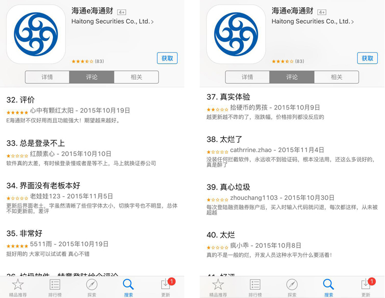 在苹果应用商店中版本号3.11的海通证券e海通财评分为三星半星,所有版本评分为三星。从版本3.10升级到3.11后,很多用户反映升级后的体验改善很大。被苹果用户反映问题较多的是在交易过程中出现闪退, 用户zhouchuang1103留言,“每次登录融资账户后,输入代码就闪退,从未被超越”。