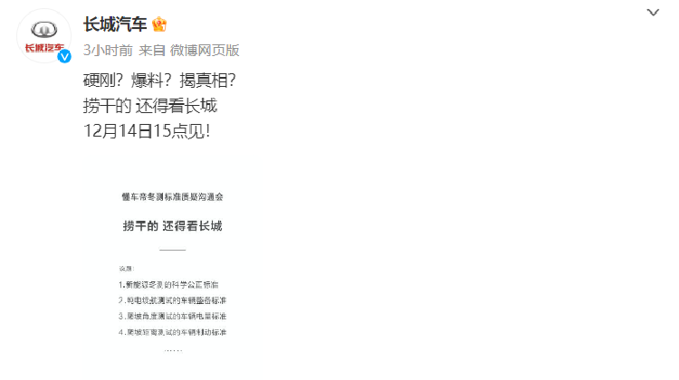 长城汽车:将于12月14日举行懂车帝冬测标准质疑沟通会