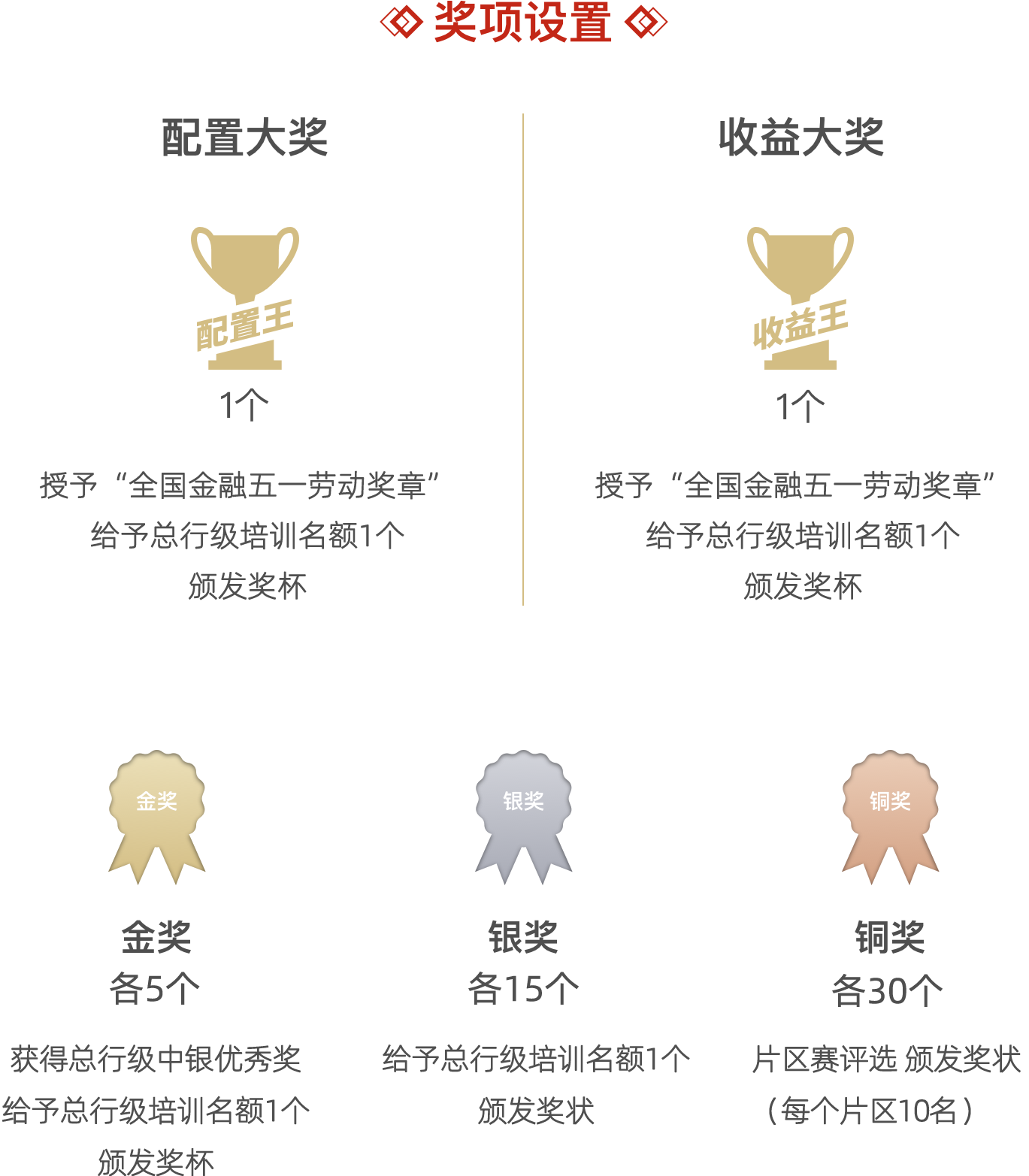 2017年12月20日,首届“中国银行个人客户经理专业技能竞赛”总决赛在中国银行总行大厦落下帷幕。来自境内和海外地区的优秀理财经理参加总决赛角逐,最终,两位优胜理财经理分别获得“理财之星”和“服务之星”金奖,他们同时获得由中国金融工会颁发的“全国金融五一劳动奖章”。“全国金融五一劳动奖章”是金融工会对全国金融行业做出突出贡献的职工授予的光荣称号,是金融行业最高荣誉奖项。 「查看详情」